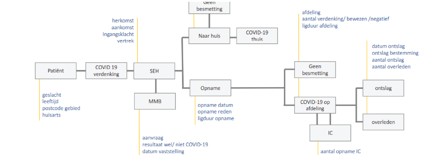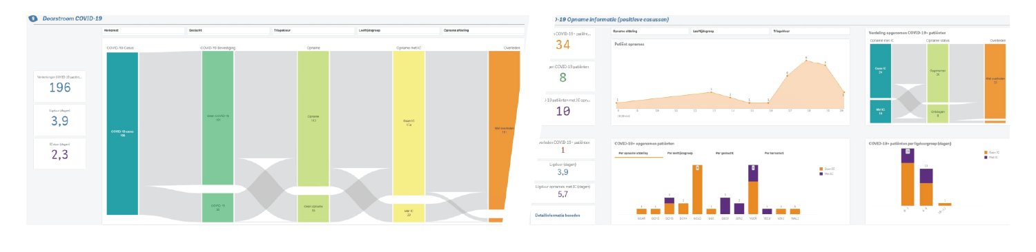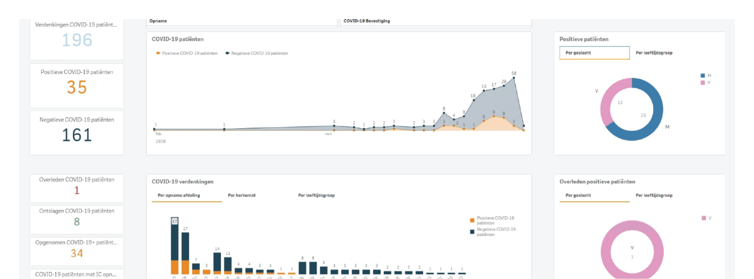 Zaterdag een week na de eerste maatregelen van de overheid is de clinical app COVID-19 live gegaan. We werden direct na het weekend gebeld door Bovenij Ziekenhuis met de spoedvraag; ‘Kunnen jullie een analyse-dashboard maken om de COVID-19 verdachte patiënten, die binnenkomen op de SEH te volgen?’ De volgende dag ging de telefoon weer en kwam een soortgelijke vraag van het Franciscus Gasthuis & Vlietland. Alle twee HiX-huizen die Qlik Sense als BI-omgeving gebruiken. Precies 4 dagen later op zaterdagochtend 21 maart zijn in beide huizen de dashboards in gebruik genomen. Met een universele data-connector halen we iedere 30 minuten de data uit HiX. Daarmee kunnen we overall informatie geven van het aantal verdachte- en positief bevonden patiënten en waar ze in het ziekenhuis liggen. Met de mogelijkheid om in te zoomen op patiëntniveau.